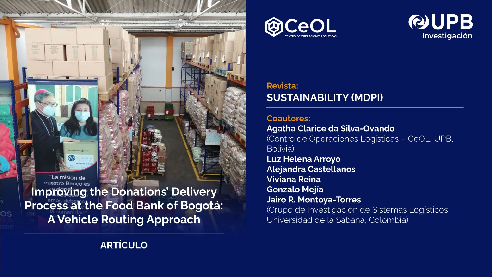 El Centro de Operaciones Logísticas de la UPB publicó un artículo científico en la revista internacional Sustainability sobre la optimización del proceso de distribución de donaciones en el Banco de Alimentos de Bogotá, en colaboración con la Universidad de la Sabana de Colombia.