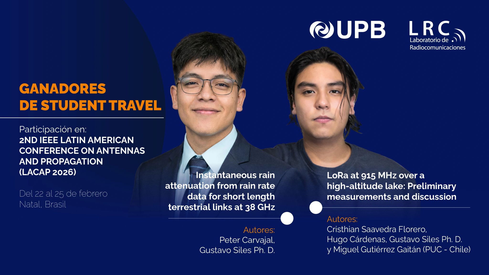 Peter Carvajal Gutiérrez y Cristhian Saavedra Florero, integrantes del Laboratorio de Radiocomunicaciones de la UPB, fueron seleccionados como ganadores de Student Travel Grants para presentar sus investigaciones en el 2nd IEEE Latin American Conference on Antennas and Propagation, celebrado en Natal, Brasil.
